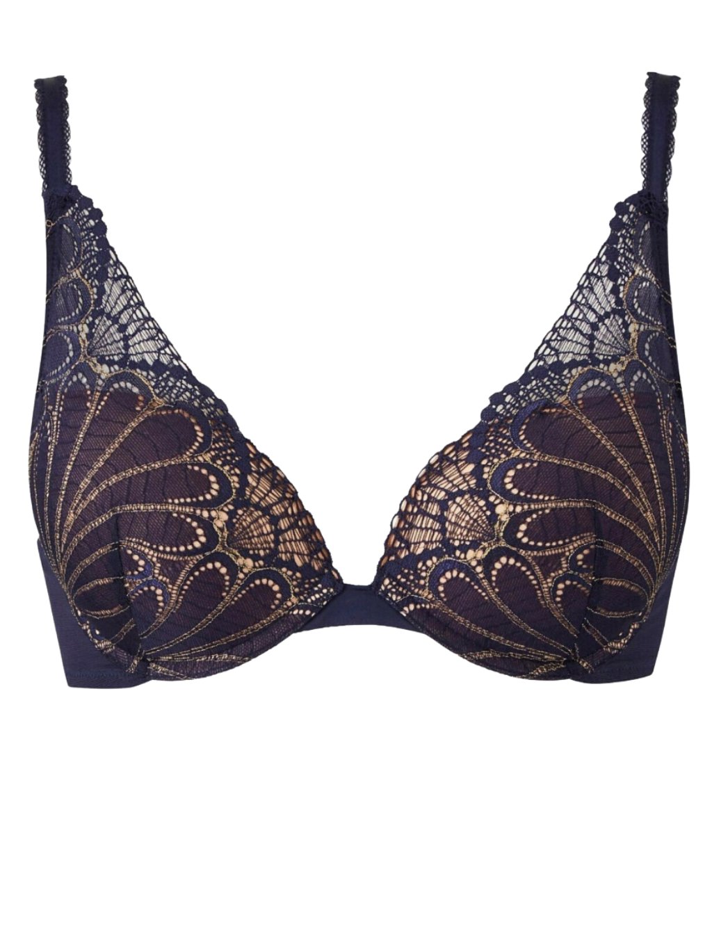 Luxusní push-up podprsenka Wonderbra v tmavě modré barvě okouzlí jemnou krajkou s elegantním zlatým vzorem a dokonale vytvaruje dekolt.